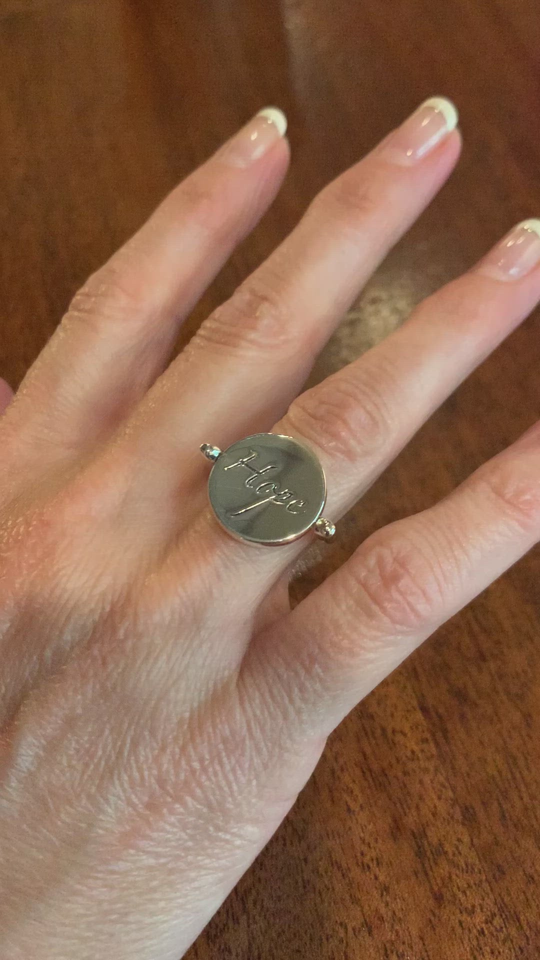 The Hope Angel Ring by Lavaggi Fine Jewelry features a reversible sterling silver disc pendant with "Hope" inscribed on one side and the Angel of Reconciliation etched on the reverse. This clever, versatile design allows you to choose which meaningful symbol to display, essentially offering two necklaces in one.